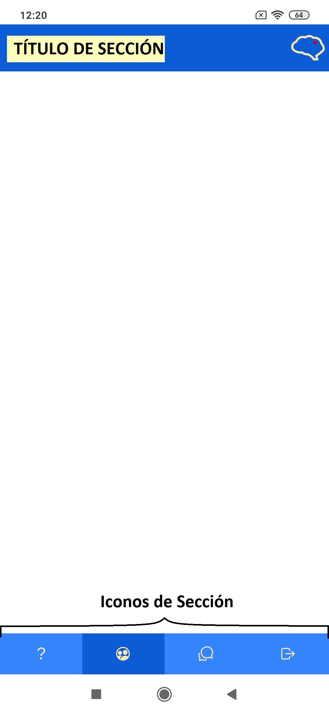 El interior de la aplicación está distribuido en secciones. La navegación entre secciones se realiza a través de los Iconos de Sección. Para mantenerse ubicado en todo momento, se muestra el título de sección o subsección en la barra superior de la aplicación.