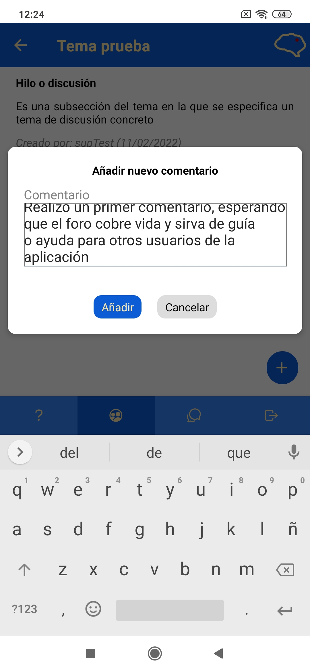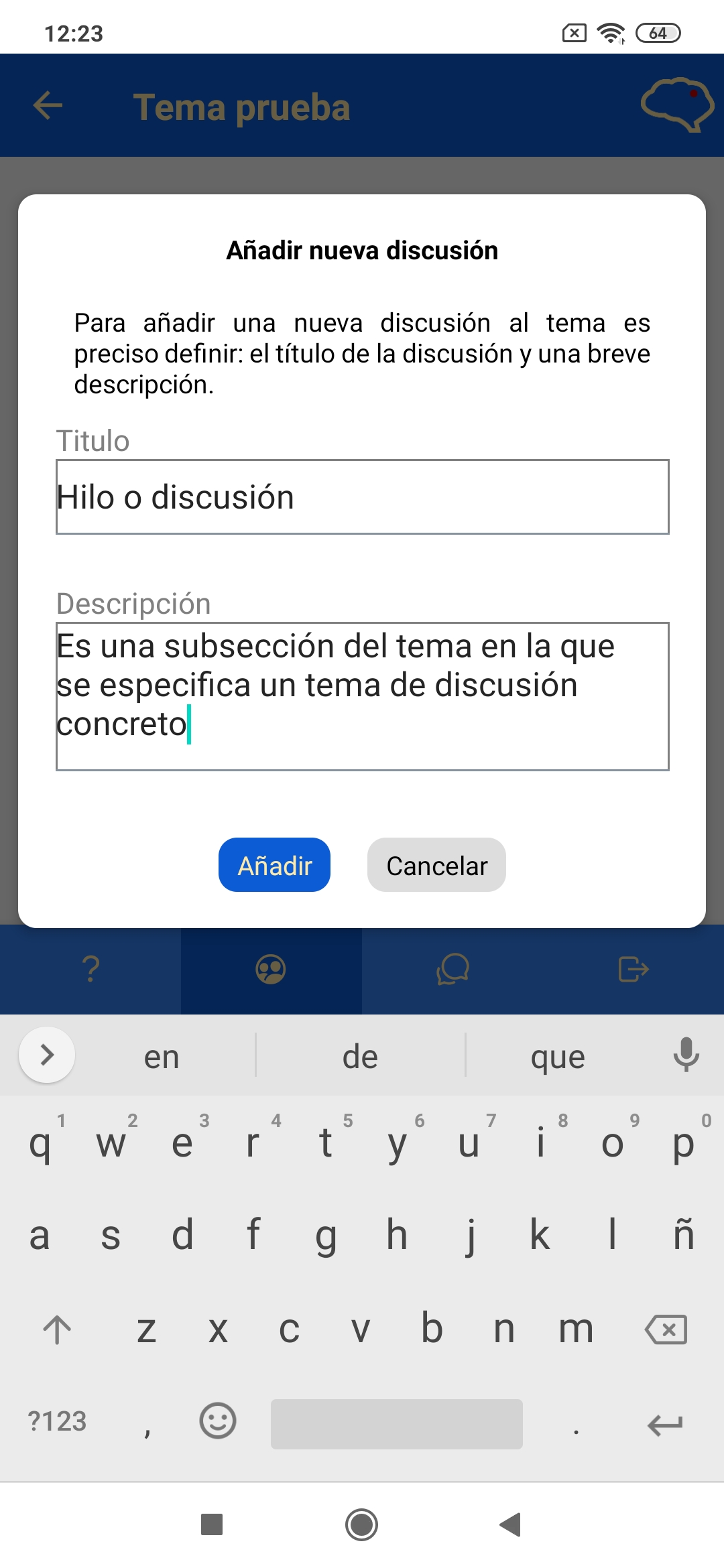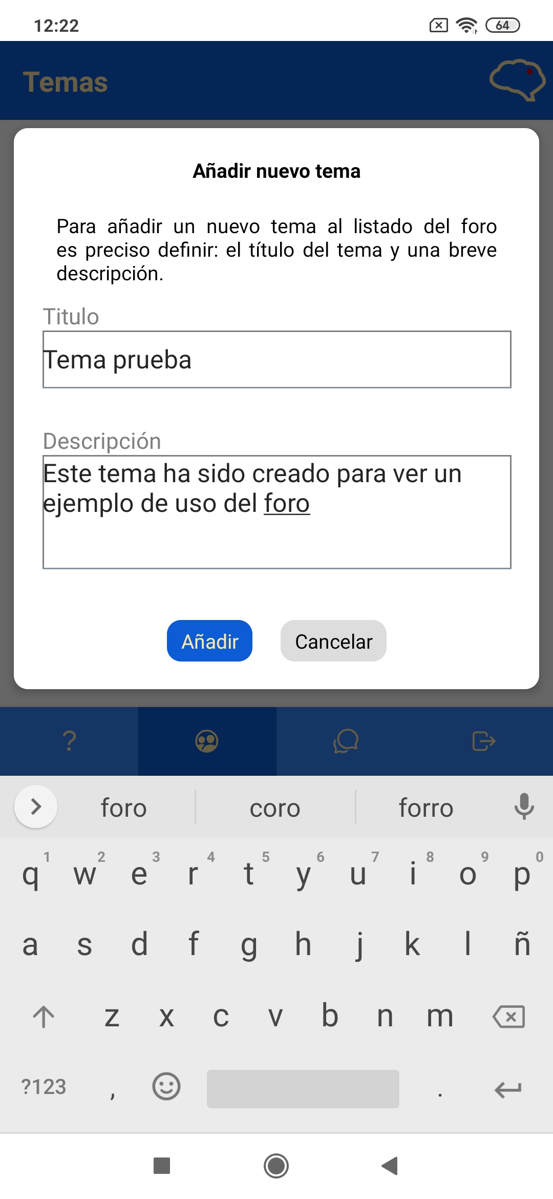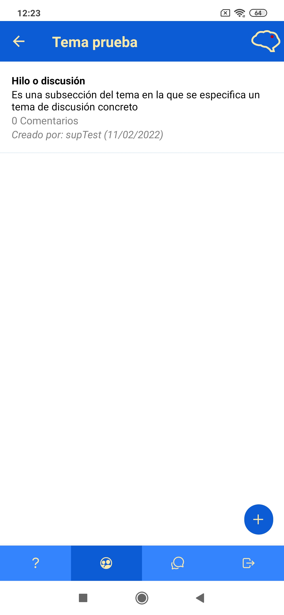 La sección de foro dispone de una navegación interna, pues se compone de TEMAS, DISCUSIONES y por último COMENTARIOS. Todas las subpantallas disponen de un botón circular abajo a la derecha, este permite añadir un nuevo tema, discusión o comentario, en función del punto de navegación en el que estemos. Para crear un tema o discusión se debe definir un título, que puede complementarse con una descripción. Ambos campos están limitados a 60 y 150 caracteres respectivamente.