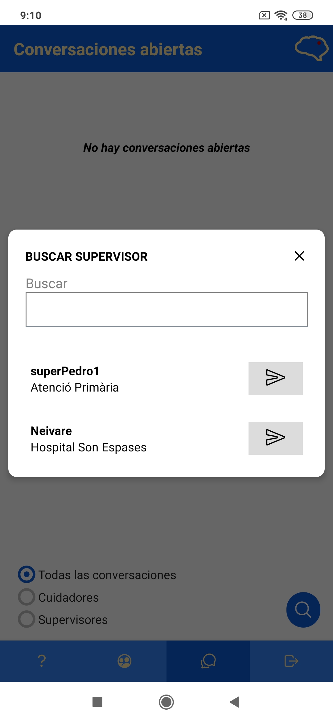 Por último, vemos como un supervisor podría iniciar una conversación con otro supervisor. En este caso, al pulsar la lupa vería un listado de supervisores. Para iniciar la conversación hay que seleccionar el botón en forma de flecha y se accede a la pantalla de chat.